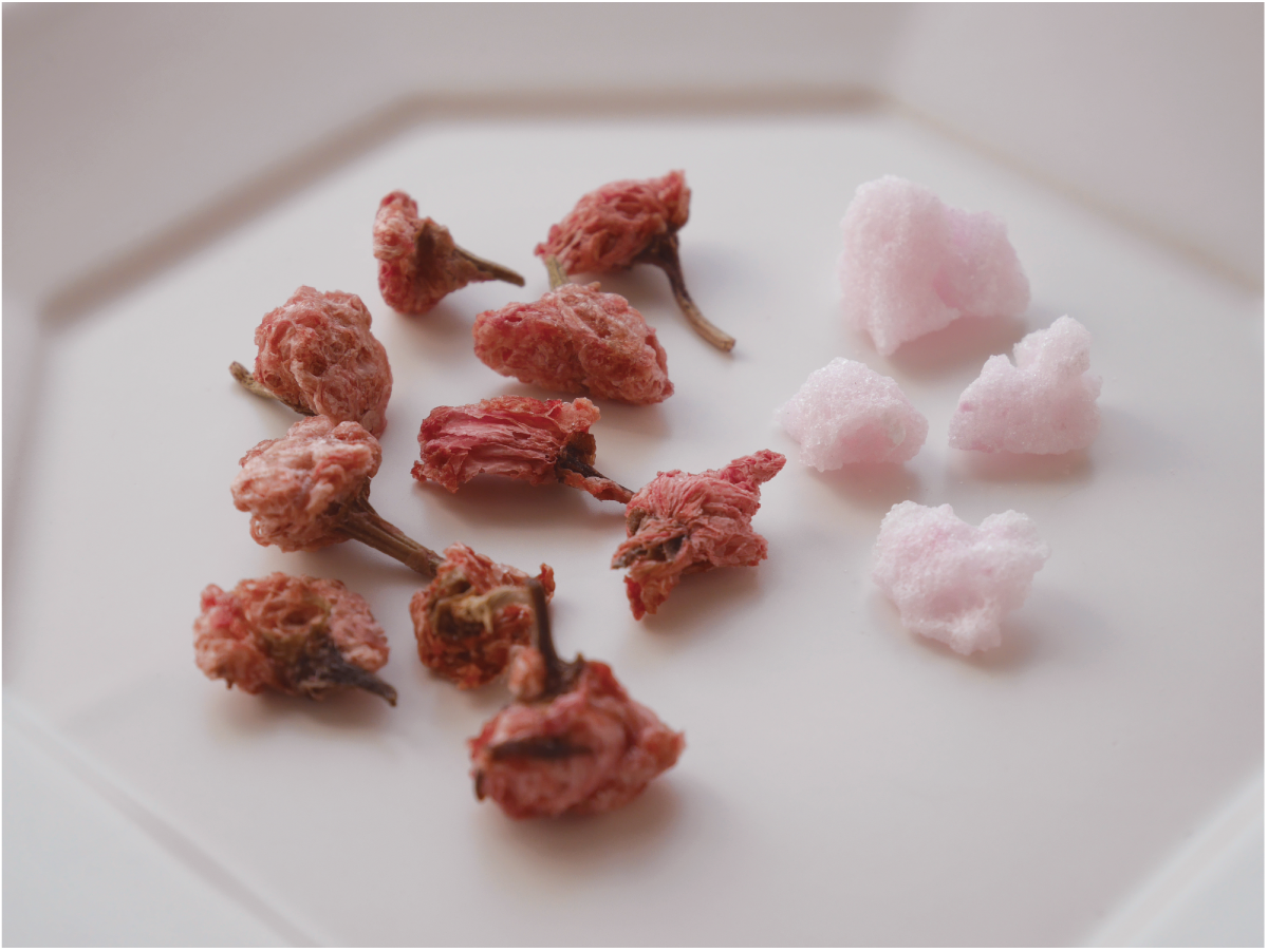 桜の花をフリーズドライ加工し、砂糖でコーティングしました。